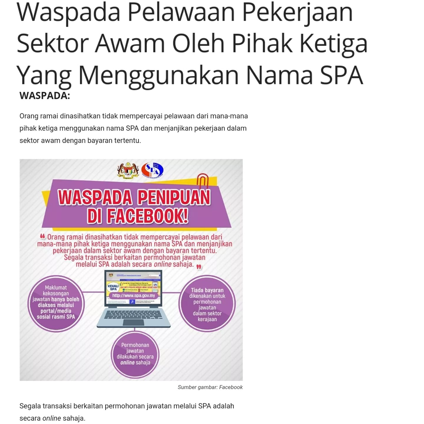 Waspada Pelawaan Pekerjaan Sektor Awam Oleh Pihak Ketiga Yang Menggunakan Nama SPA