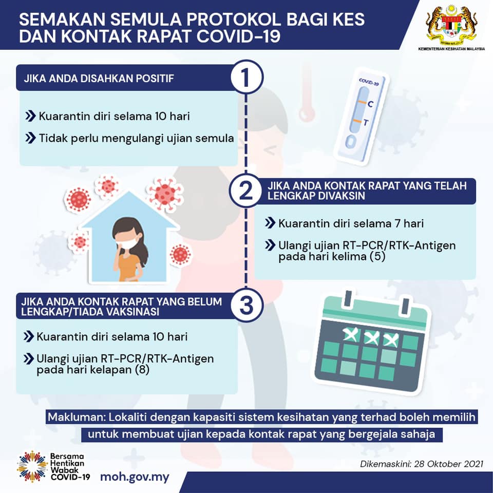 Jika anda kontak rapat yang belum lengkap vaksinasi / tiada vaksinasi, kuarantin diri selama 10 hari dan ulangi ujian pada hari kelapan.