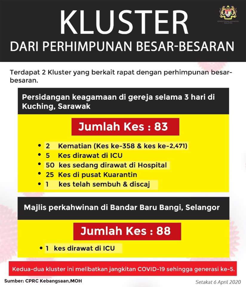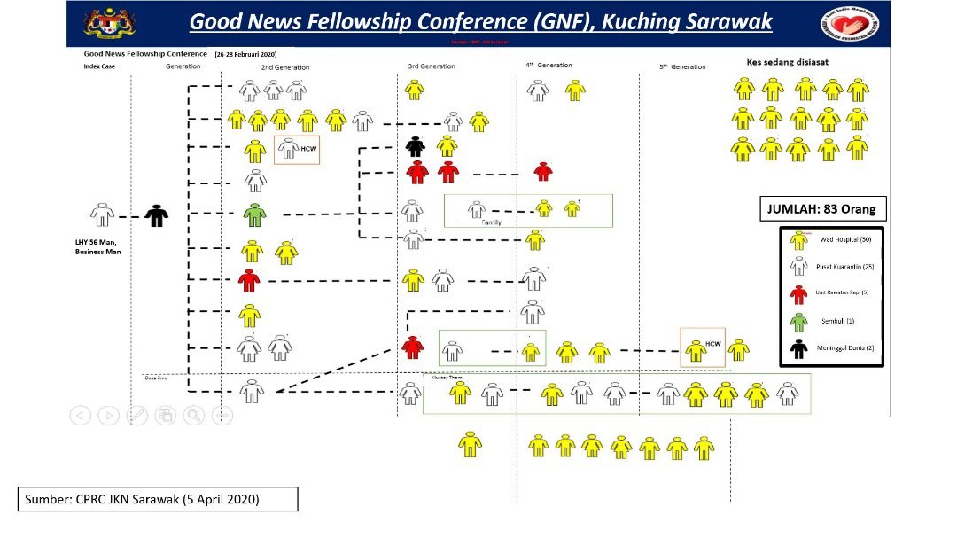 1. Persidangan keagamaan di Kuching selama 3 hari. 83 org positif (2 kematian, 5 ICU, 50 sedang dirawat, 25 di pusat kuarantin dan 1 sembuh).