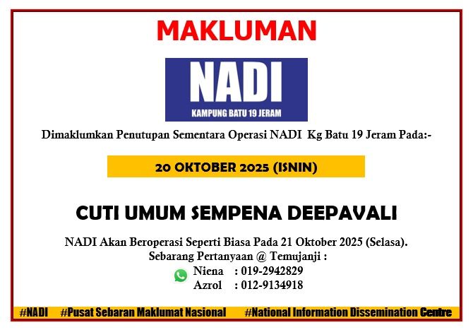 Makluman penutupan sementara operasi Pusat Sebaran Maklumat Nasional (NADI) Kampung Batu 19 Jeram Sempena Cuti Umum Perayaan Deepavali.