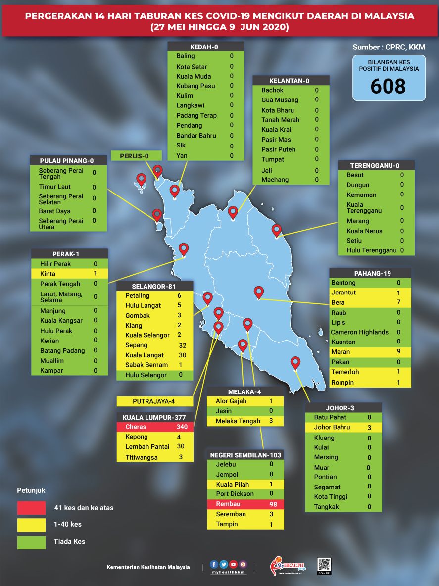 PERGERAKAN 14 HARI TABURAN KES COVID 19 MENGIKUT DAERAH DI MALAYSIA 27 MEI – 09 JUN 2020