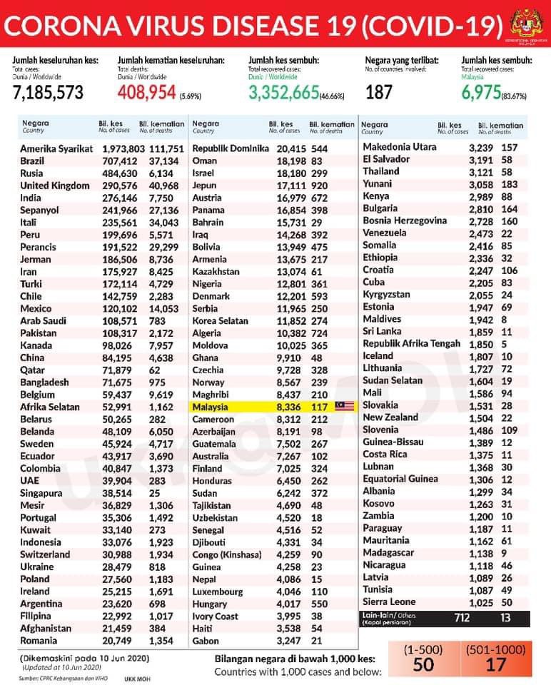 STATISTIK COVID 19 NEGARA SELURUH DUNIA 10 JUN 2020