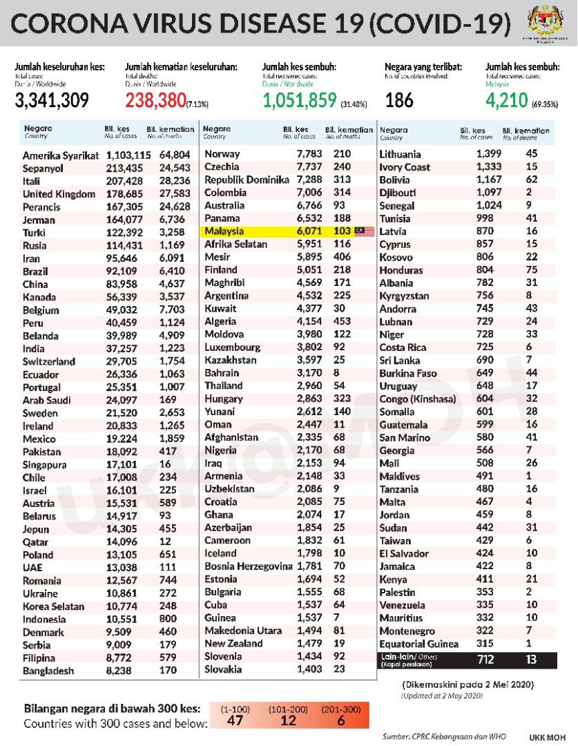 STATISTIK COVID 19 NEGARA SELURUH DUNIA 2 MEI 2020